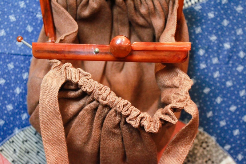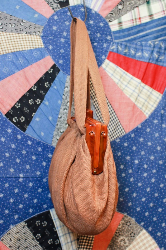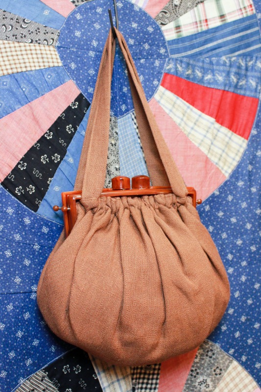 VINTAGE 40s-50s LINEN TEXTURE CURTAIN ROD HANDBAG (BRN)